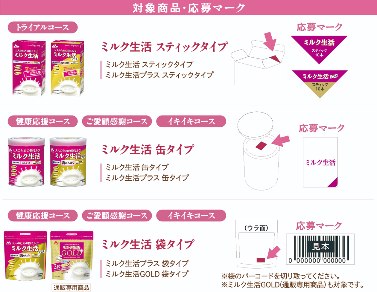 専用応募ハガキの応募マーク貼付欄に、対象商品の応募マークをご希望の賞品コースの必要枚数分貼り、ご住所、お名前、電話番号、年齢、性別、主な購入先をご記入のうえ、切手を貼ってご応募ください。